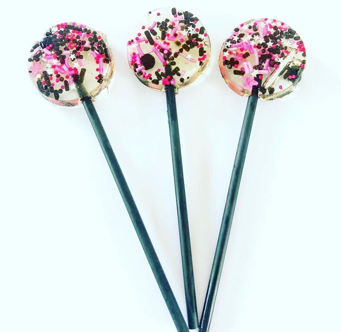 Clear lollipops filled with hot pink and black sprinkles and hints of metallic.